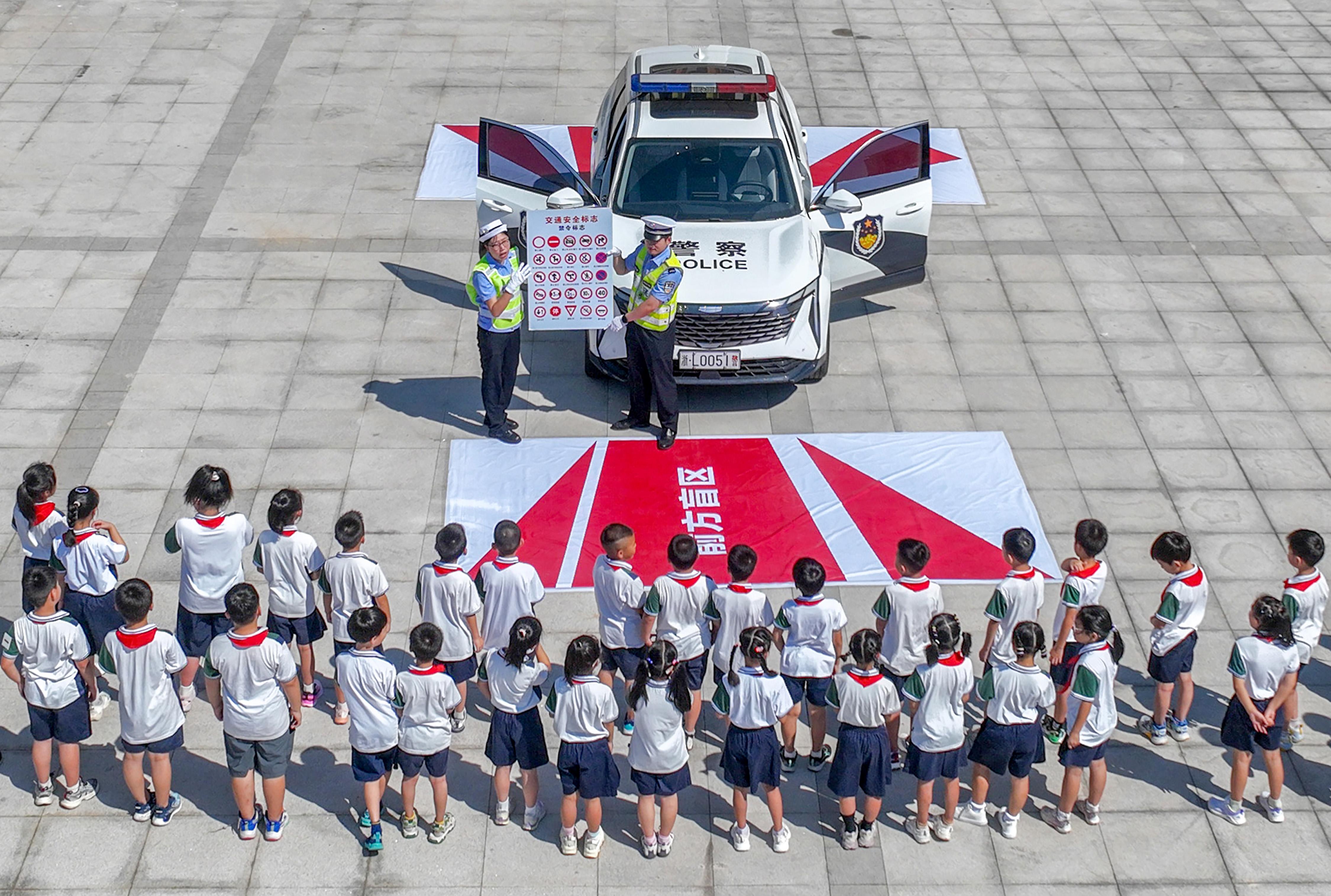 9月1日,浙江省武義縣公安局交警大隊(duì)民警輔警走進(jìn)轄區(qū)壺山小學(xué),為新入學(xué)的一年級(jí)小學(xué)生送上交通安全教育第一課。