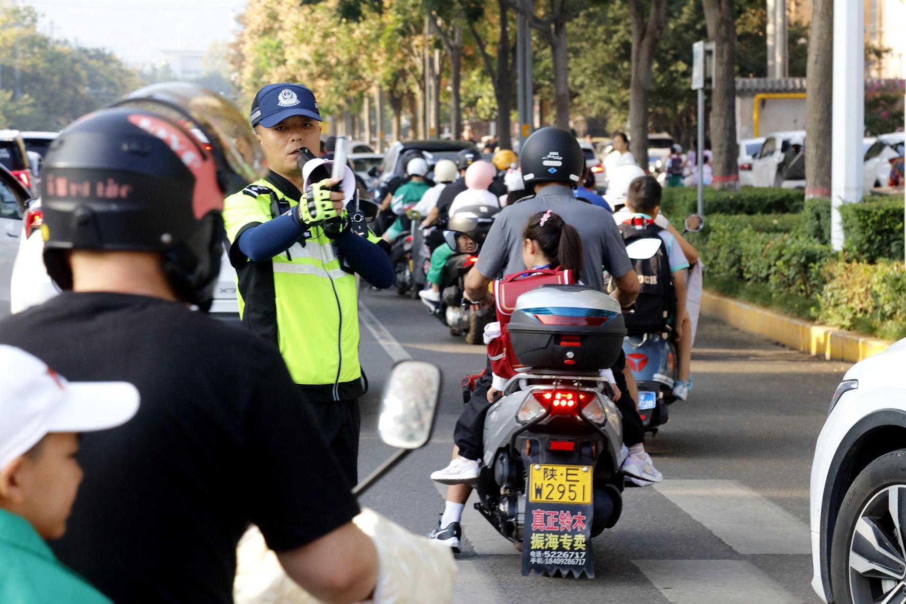 9月1日,陜西省渭南市公安局交警支隊(duì)臨渭大隊(duì)民警在渭南市實(shí)驗(yàn)小學(xué)十字路口指揮疏導(dǎo)車(chē)輛。