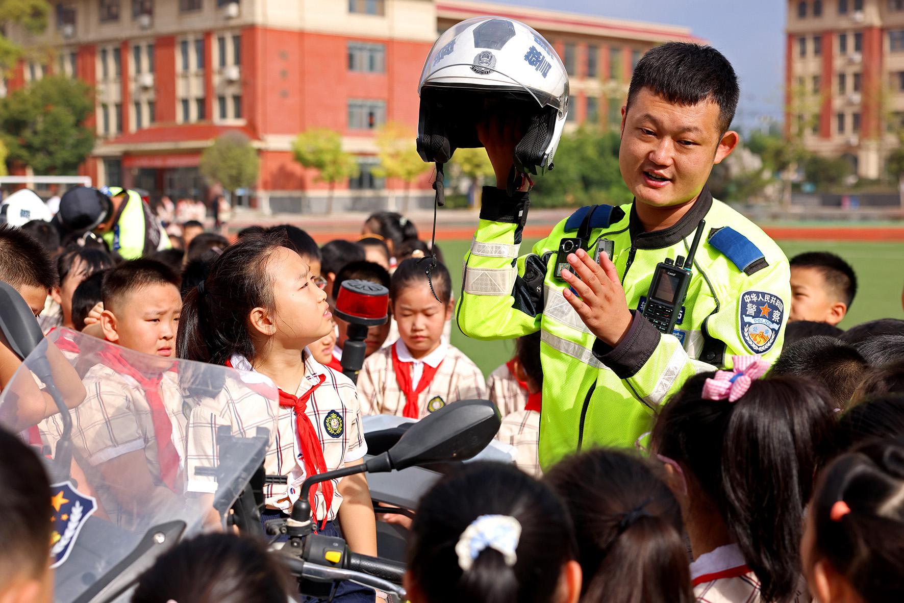 9月1日,山東省棗莊市公安局市中分局交通管理大隊(duì)鐵騎隊(duì)員在東湖小學(xué)向?qū)W生們普及交通安全知識(shí)。