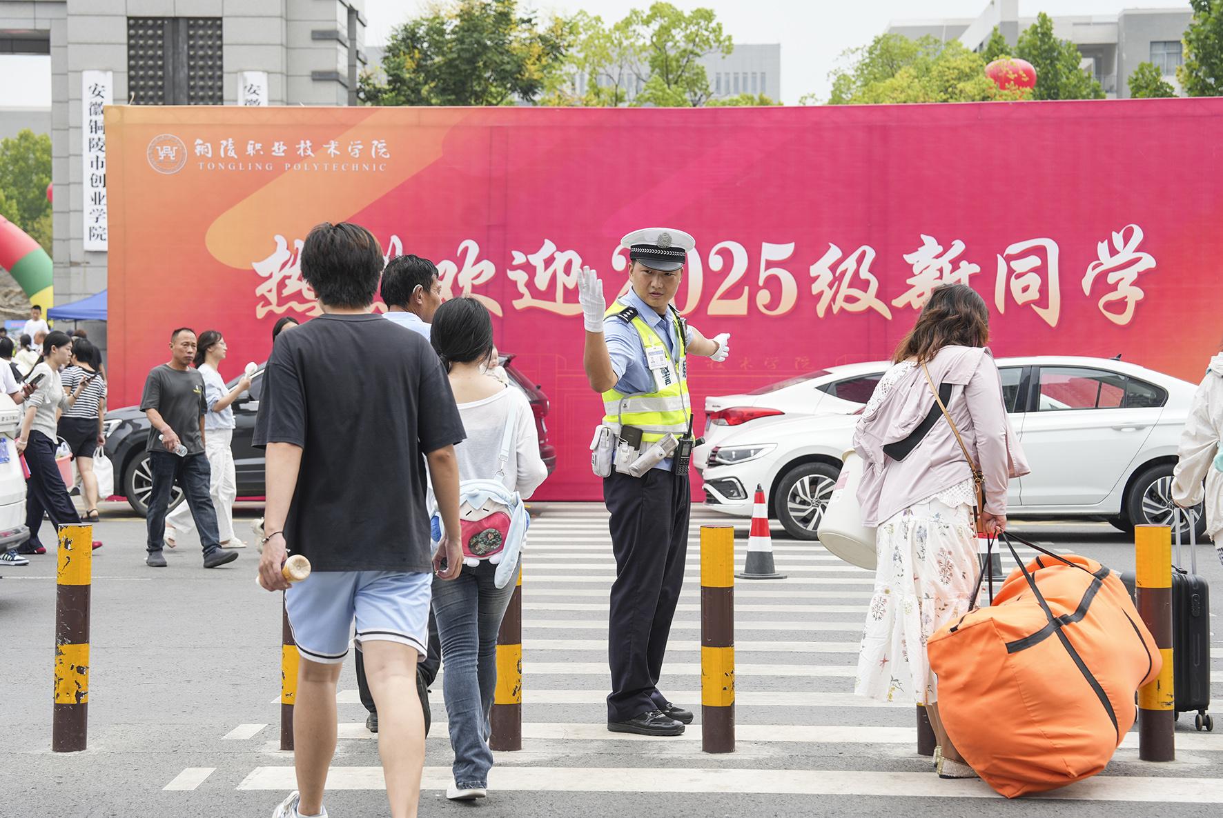 9月7日,安徽省銅陵職業(yè)技術(shù)學(xué)院迎來2025級(jí)新生報(bào)到高峰。銅陵市公安局交警支隊(duì)科學(xué)部署警力疏導(dǎo)交通秩序,有效緩解校園周邊交通壓力。