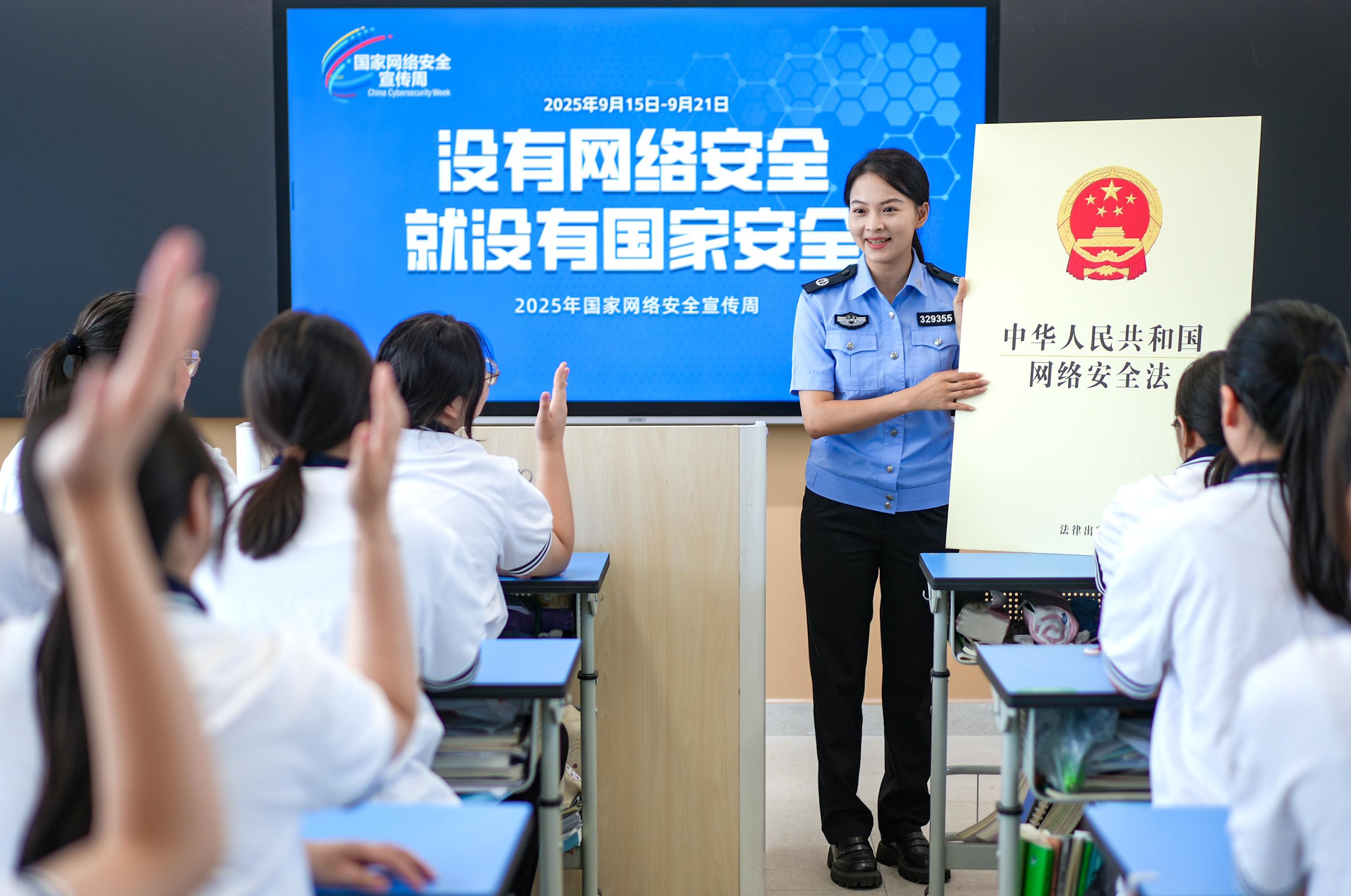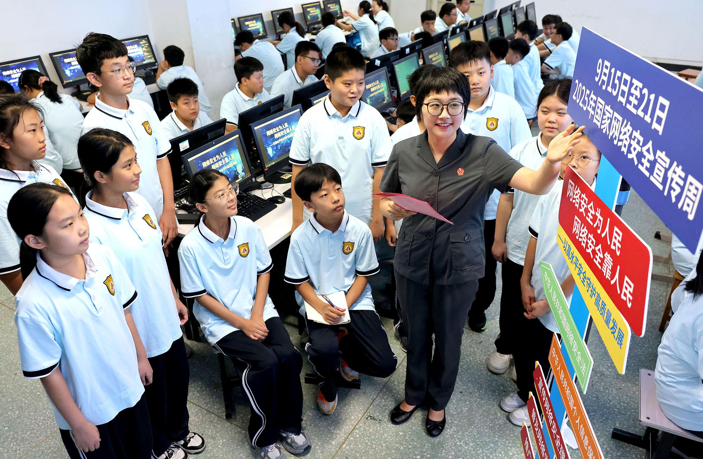 9月15日,在山東省棗莊市第四十一中學(xué),棗莊市市中區(qū)人民法院的法官為學(xué)生們普及網(wǎng)絡(luò)安全知識(shí)。