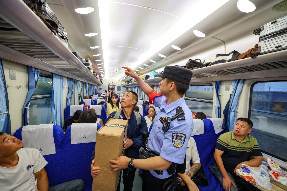 10月14日,劉濤在K845次列車上指導旅客安全擺放行李。