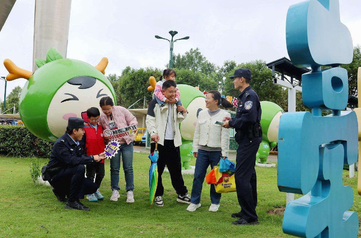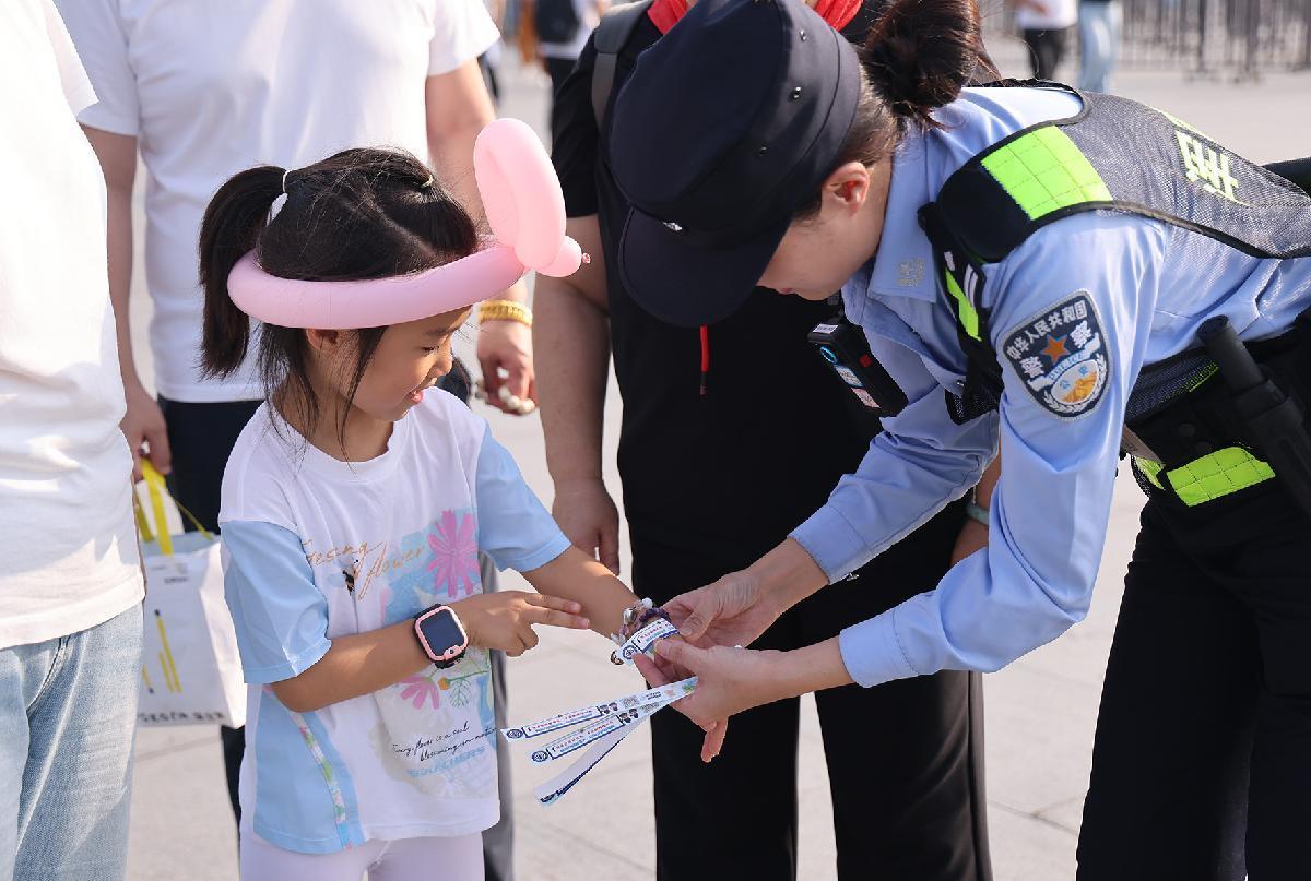 10月1日,遼寧省沈陽(yáng)市公安局渾南分局民警為小朋友佩戴防走失手帶。