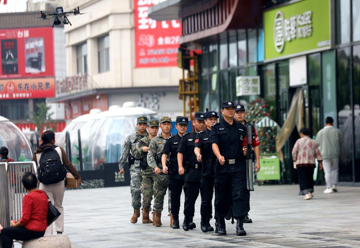 10月1日,安徽省舒城縣公安局特巡警聯(lián)合武警在商圈開(kāi)展巡邏。