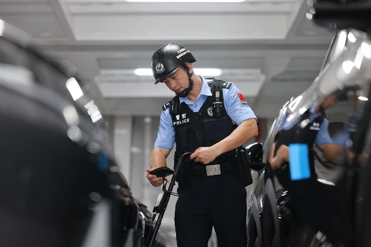 10月2日,江蘇邊檢總站太倉(cāng)邊檢站民警對(duì)出口汽車(chē)進(jìn)行查驗(yàn)。