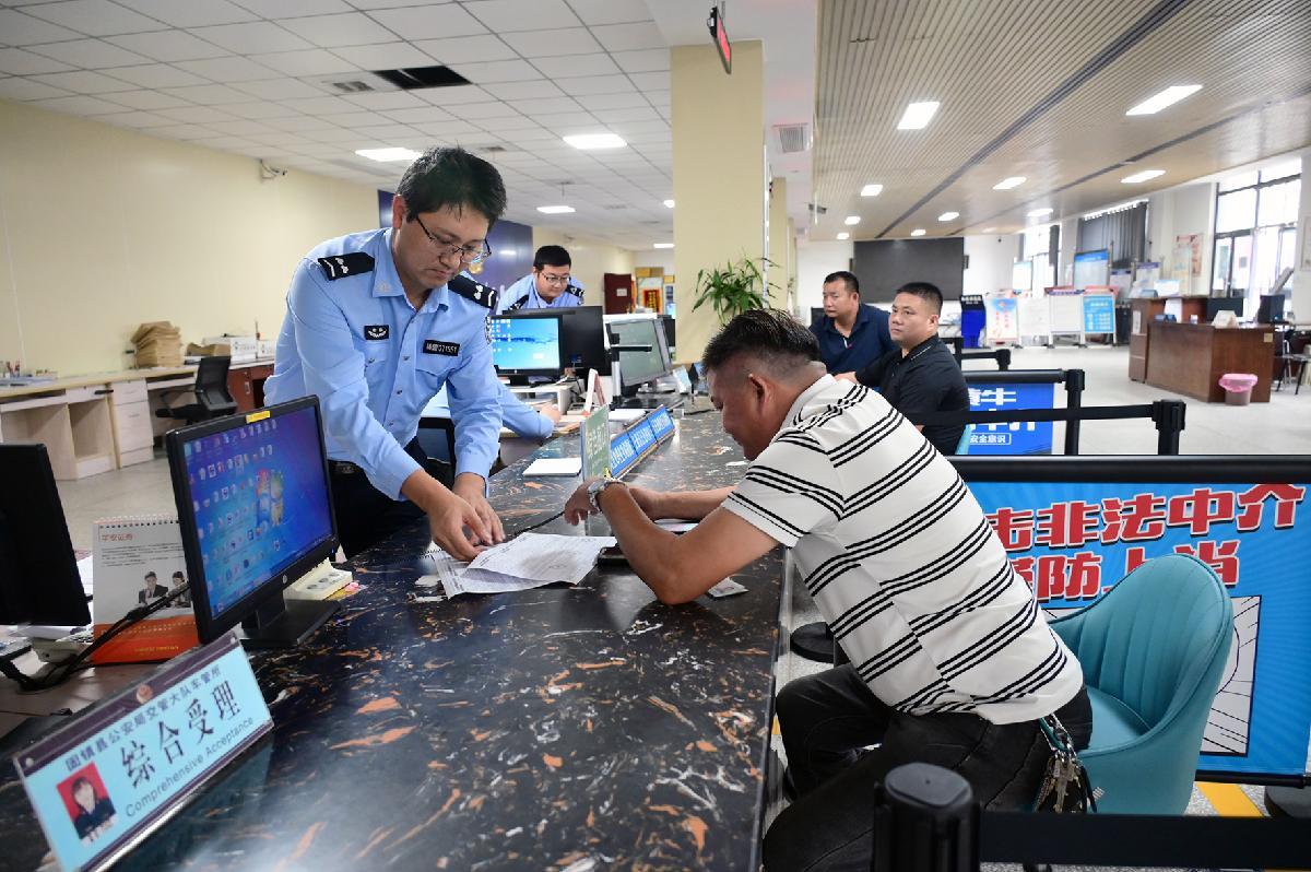 10月1日,安徽省固鎮(zhèn)縣公安局交管大隊(duì)民輔警在車(chē)管大廳為群眾辦理車(chē)駕管業(yè)務(wù)。