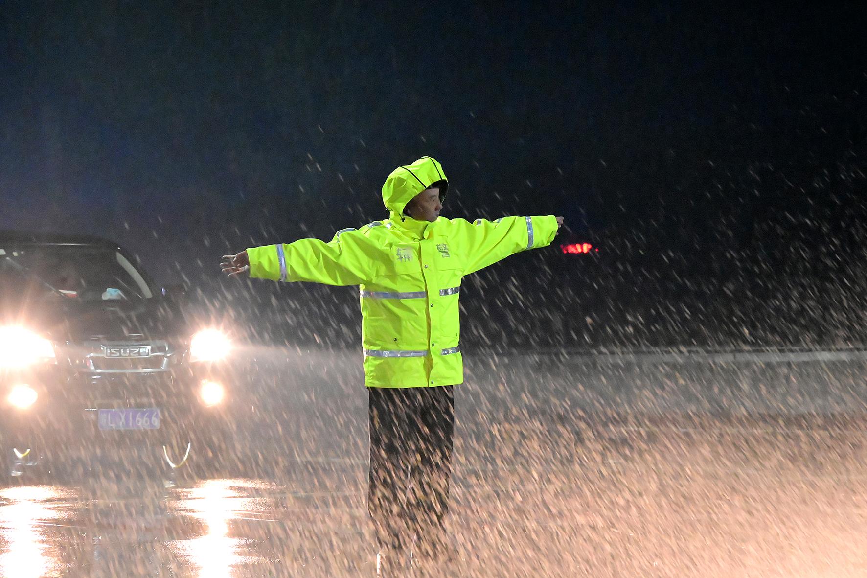 10月25日,安徽省固鎮(zhèn)縣出現(xiàn)降雨天氣。固鎮(zhèn)縣公安局交管大隊民警輔警冒雨堅守路面,加強道路的巡邏管控和指揮疏導(dǎo),確保交通安全。