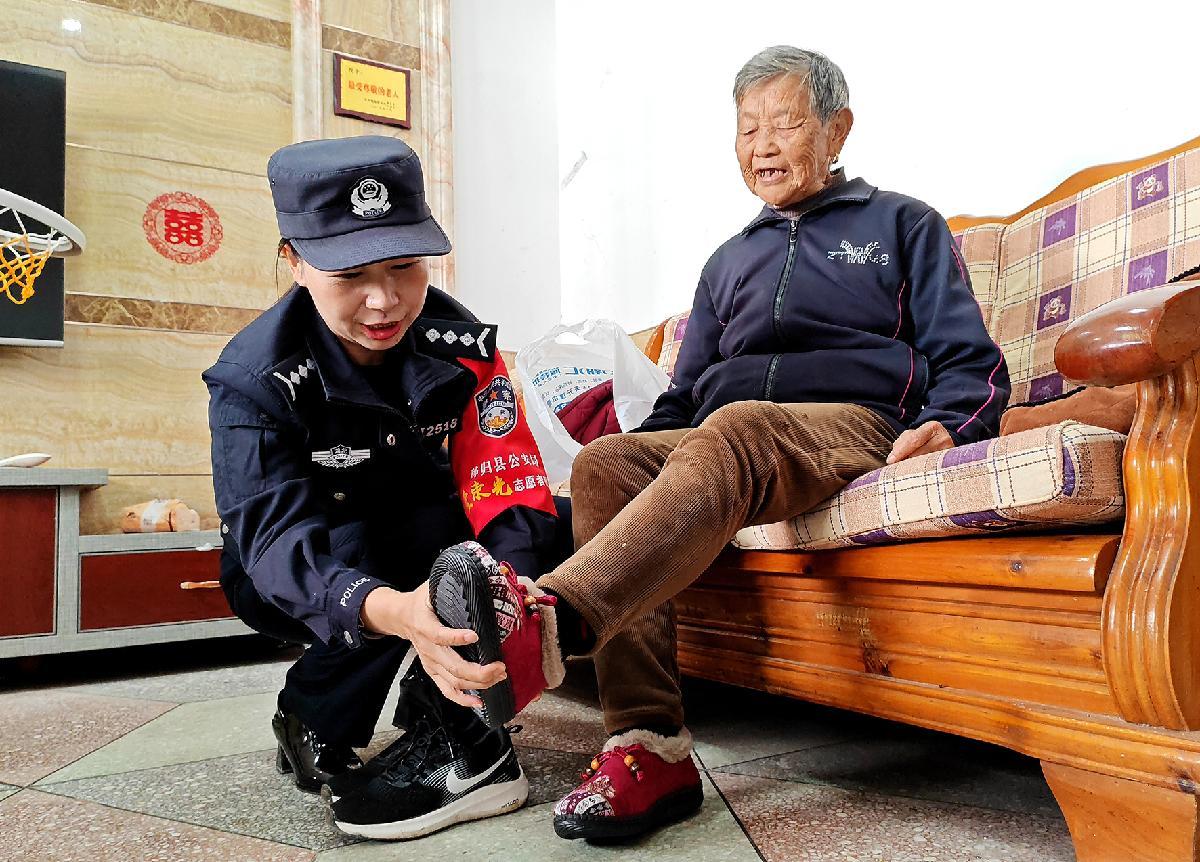 10月28日,在湖北省宜昌市秭歸縣茅坪鎮(zhèn)陳家沖村四組,秭歸縣公安局一束光志愿服務(wù)隊(duì)上門慰問現(xiàn)年82歲、照護(hù)殘障兒子58年的母親望開瓊。