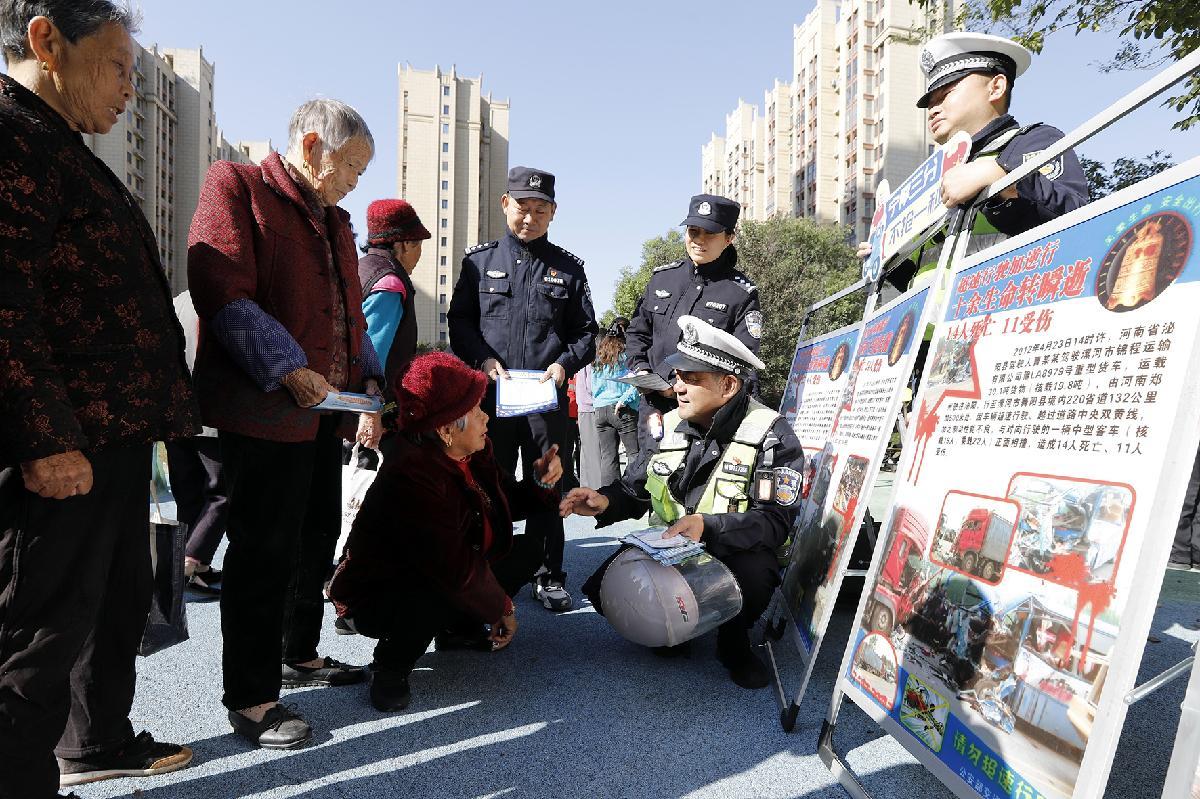 10月29日重陽節(jié),安徽省蕪湖市公安局交管支隊(duì)鳩江大隊(duì)民警輔警走進(jìn)二壩鎮(zhèn)盛世華府小區(qū),向老年人群宣傳“一盔一帶”、反詐等安全知識(shí)。
