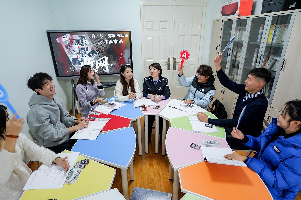 11月17日,山東省煙臺(tái)市公安局萊山分局民警在煙臺(tái)大學(xué)組織開展名為《收網(wǎng)》的劇本殺反詐宣傳,讓學(xué)生們通過角色扮演,在虛擬交鋒中錘煉現(xiàn)實(shí)防騙能力。