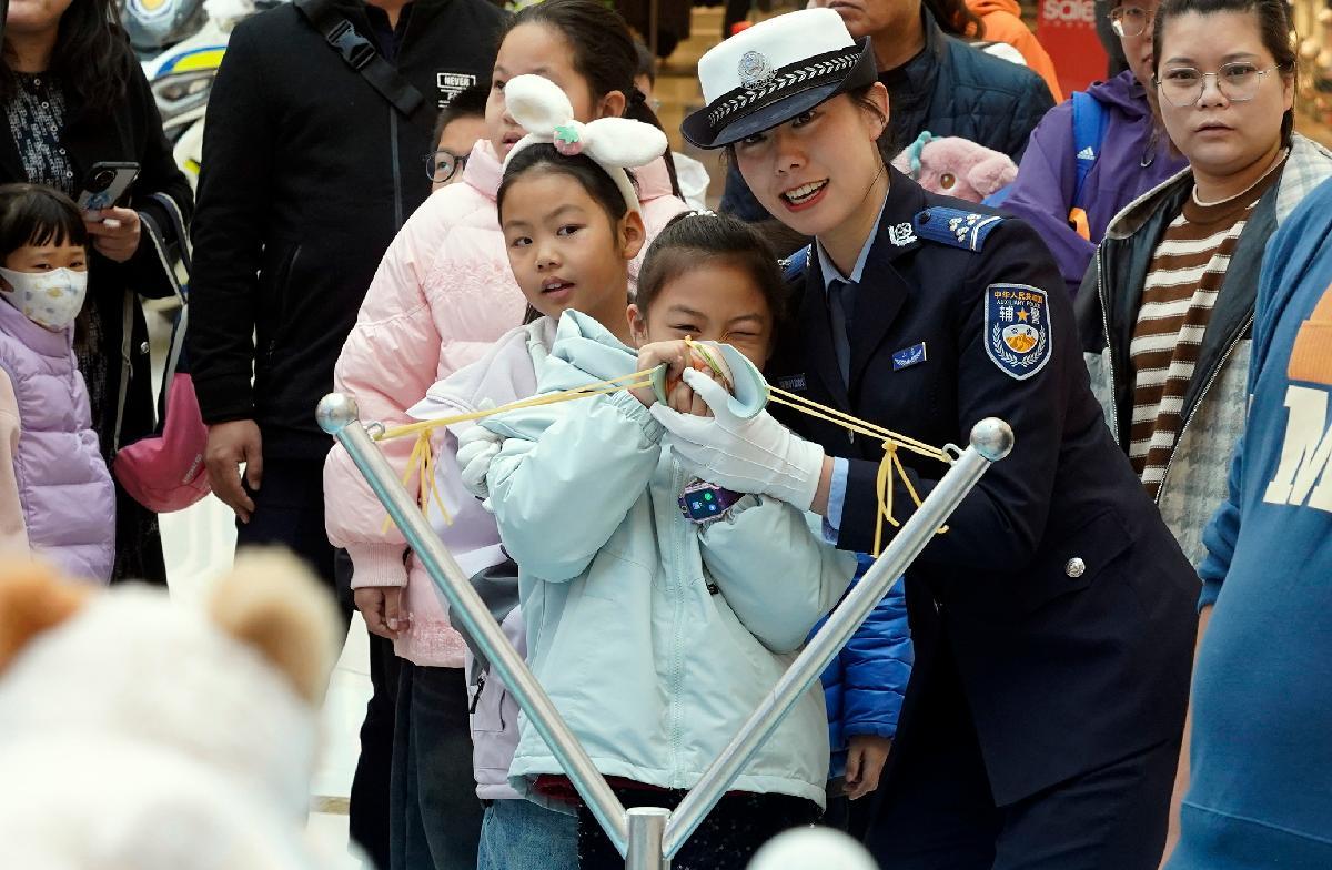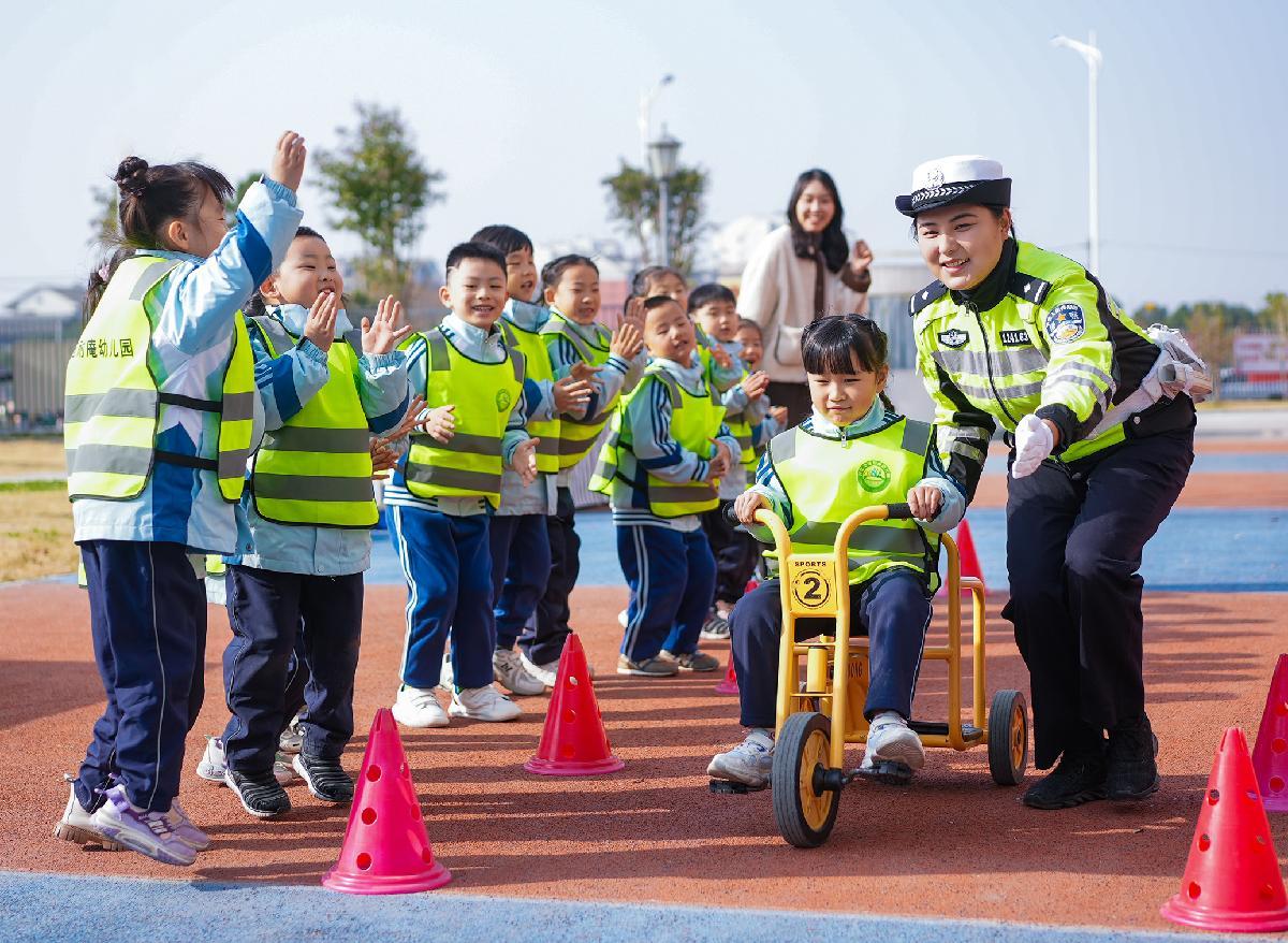 12月1日,在江蘇省興化市施耐庵幼兒園,興化市公安局民警通過趣味游戲的方式為小朋友們講解交通安全知識(shí)。