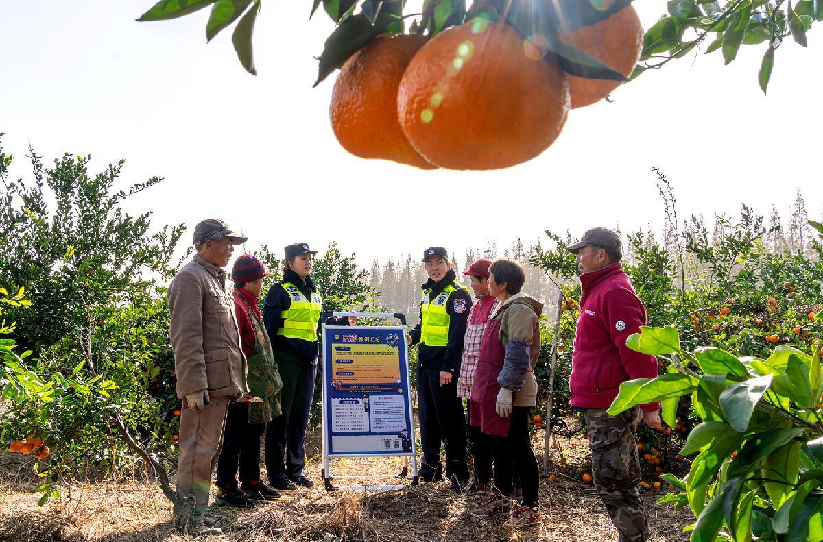 11月28日,上海市公安局崇明分局綠華派出所民警走進(jìn)果園,向采收柑橘的果農(nóng)們開展防盜、防騙、交通安全等普法宣傳。