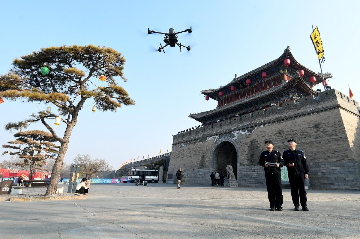圖為1月4日,民輔警正在古城景區(qū)進行警用無人機飛行訓練。