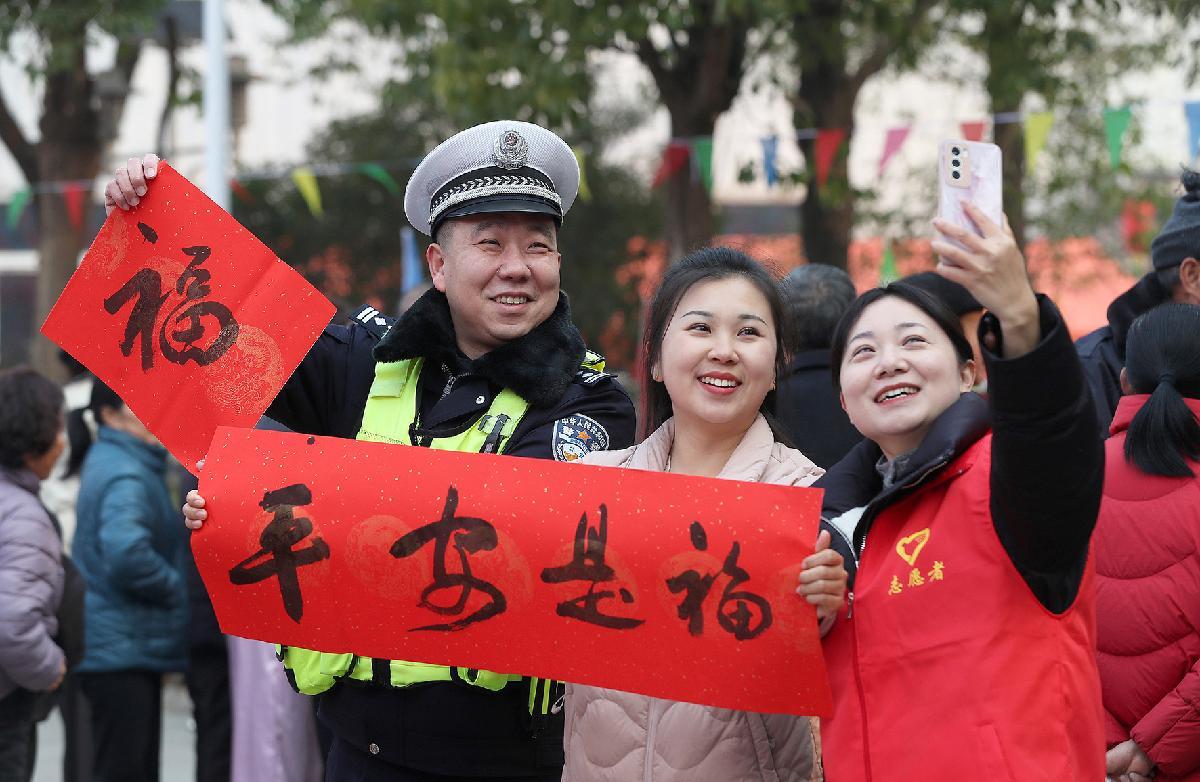 1月17日,湖北省荊門市公安局交管支隊(duì)東寶大隊(duì)民警在東寶區(qū)仙居鄉(xiāng)年貨大集上,開展“送春聯(lián)話平安”主題活動。