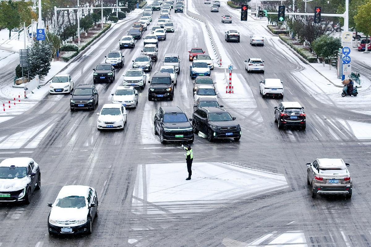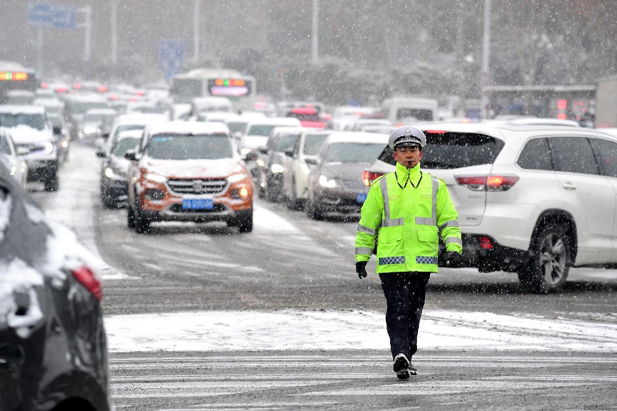 1月20日,安徽省蕪湖市主城區(qū)迎來暴風(fēng)雪天氣。蕪湖市公安局交管支隊弋江大隊全警上崗,疏導(dǎo)交通,確保轄區(qū)道路暢通有序。