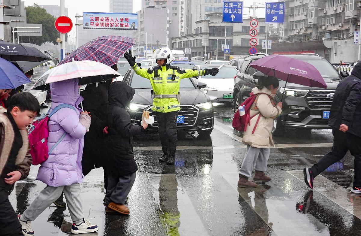 1月19日,安徽省銅陵市雨雪低溫天氣來襲。銅陵市公安局交管支隊立即啟動應(yīng)急預(yù)案,增派中小學(xué)?!白o(hù)學(xué)崗”警力,全力守護(hù)學(xué)生出行安全。