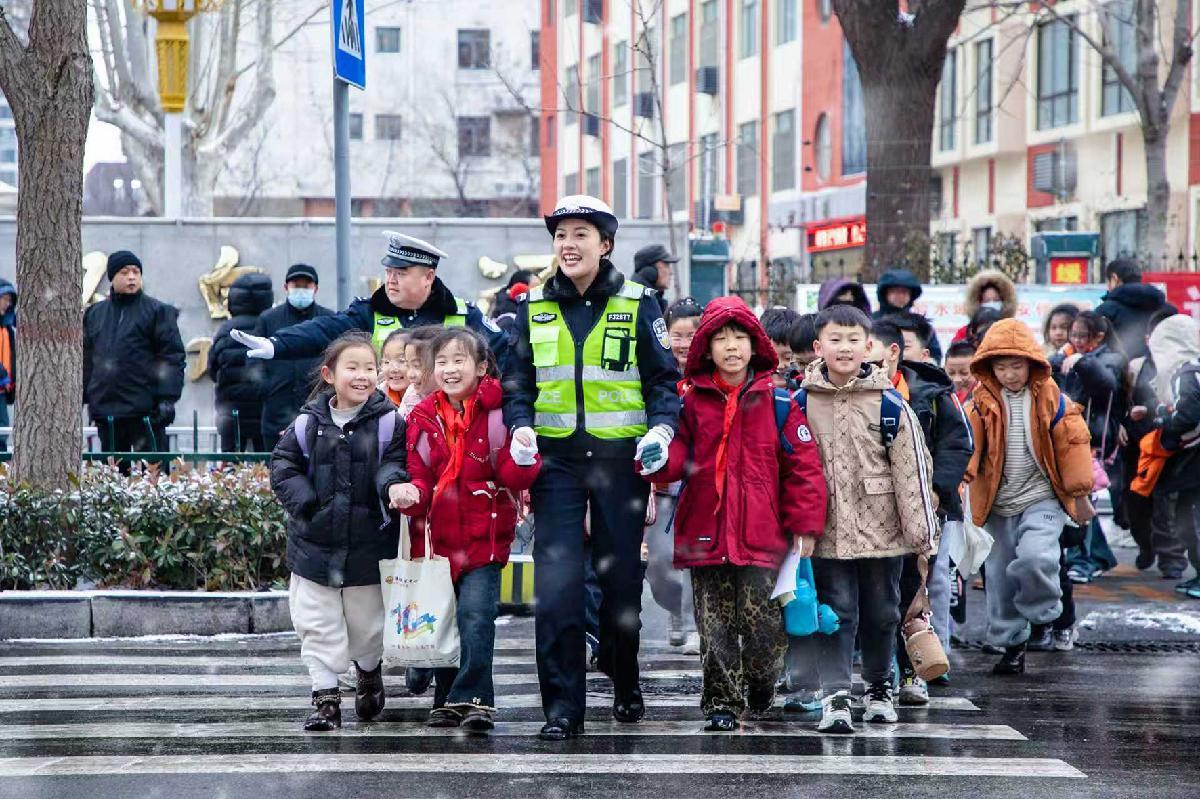 1月19日,山東省煙臺市公安局芝罘分局民警冒雪在轄區(qū)幼兒園門口執(zhí)勤,護(hù)送孩子們平安放學(xué)。
