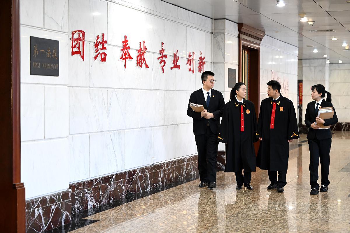 2025年12月31日,北京市朝陽區(qū)人民法院民二庭法官王菁璐(左二)與法官周劍彬(右二)在前往法庭的路上,分析案件審理思路。