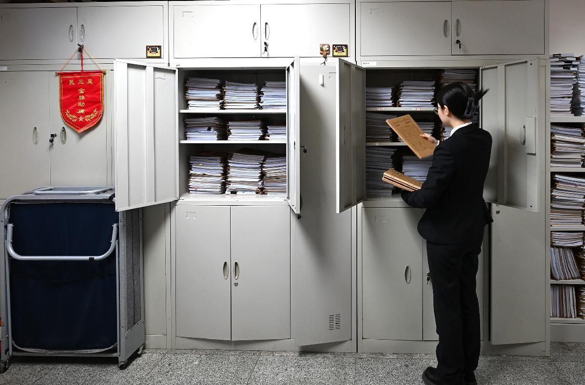 2025年12月31日下午5時(shí),北京市朝陽區(qū)人民法院民三庭法官助理熊格將2025年審結(jié)最后一個(gè)案件的卷宗整理好、放入卷柜中。