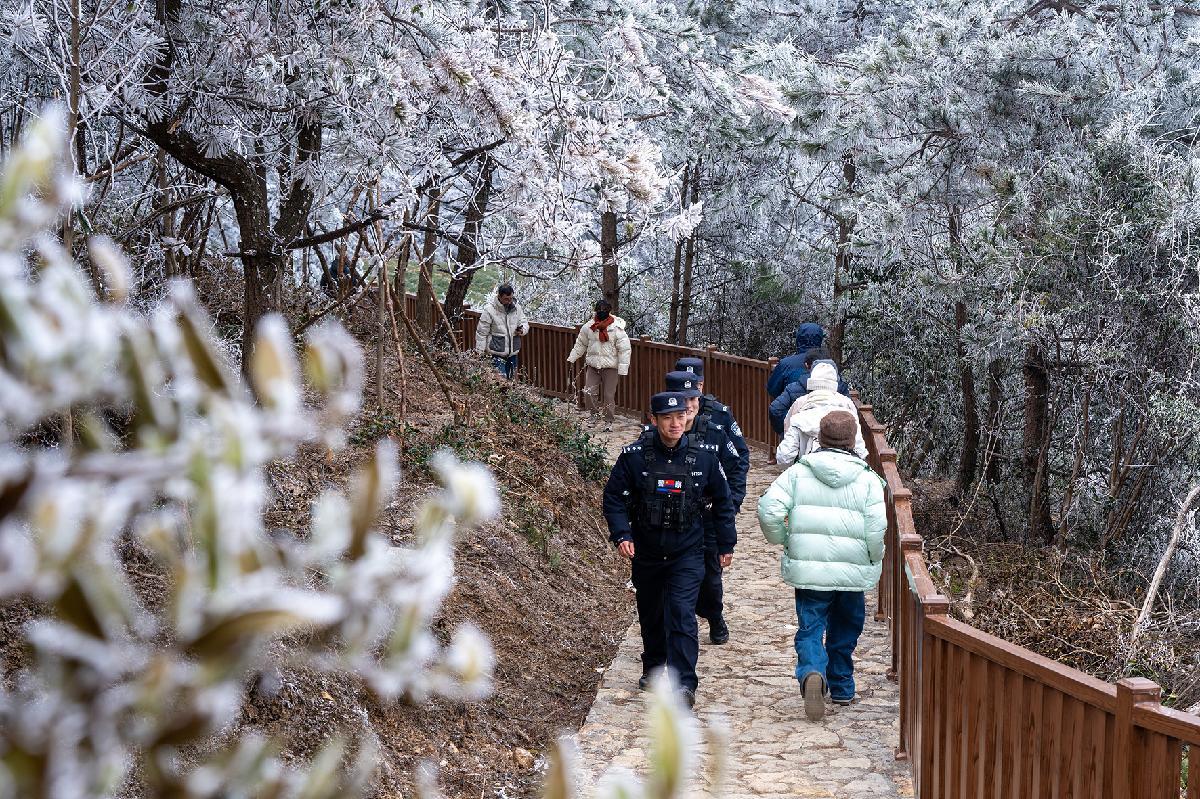 1月22日,受寒潮影響,浙江省臺(tái)州市黃巖區(qū)大寺基林區(qū)出現(xiàn)壯美的霧凇景觀,吸引了大批游客。臺(tái)州市公安局黃巖分局寧溪派出所加強(qiáng)林區(qū)的巡邏防控,服務(wù)群眾,確保游客平安出行。