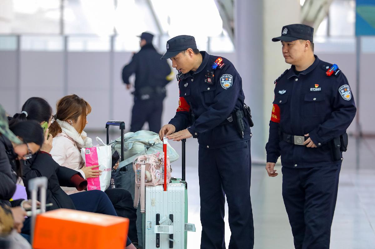 2月2日,山東省青島北站派出所民輔警在候車室執(zhí)勤巡邏,服務(wù)旅客。