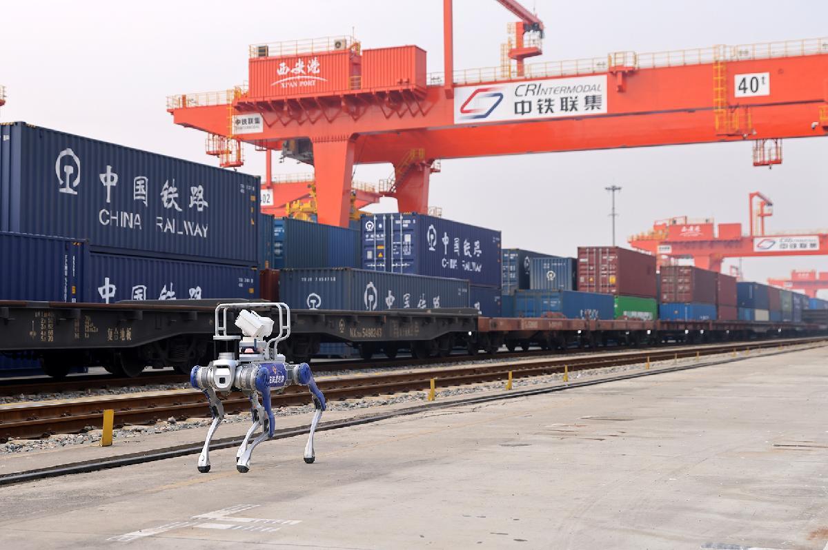 2月4日,在中歐班列(西安)起點(diǎn)西安國際港站內(nèi),由西安鐵路公安處、西北工業(yè)大學(xué)光電與智能研究院共同研發(fā)的智能巡控機(jī)器狗正在開展巡邏作業(yè)。
