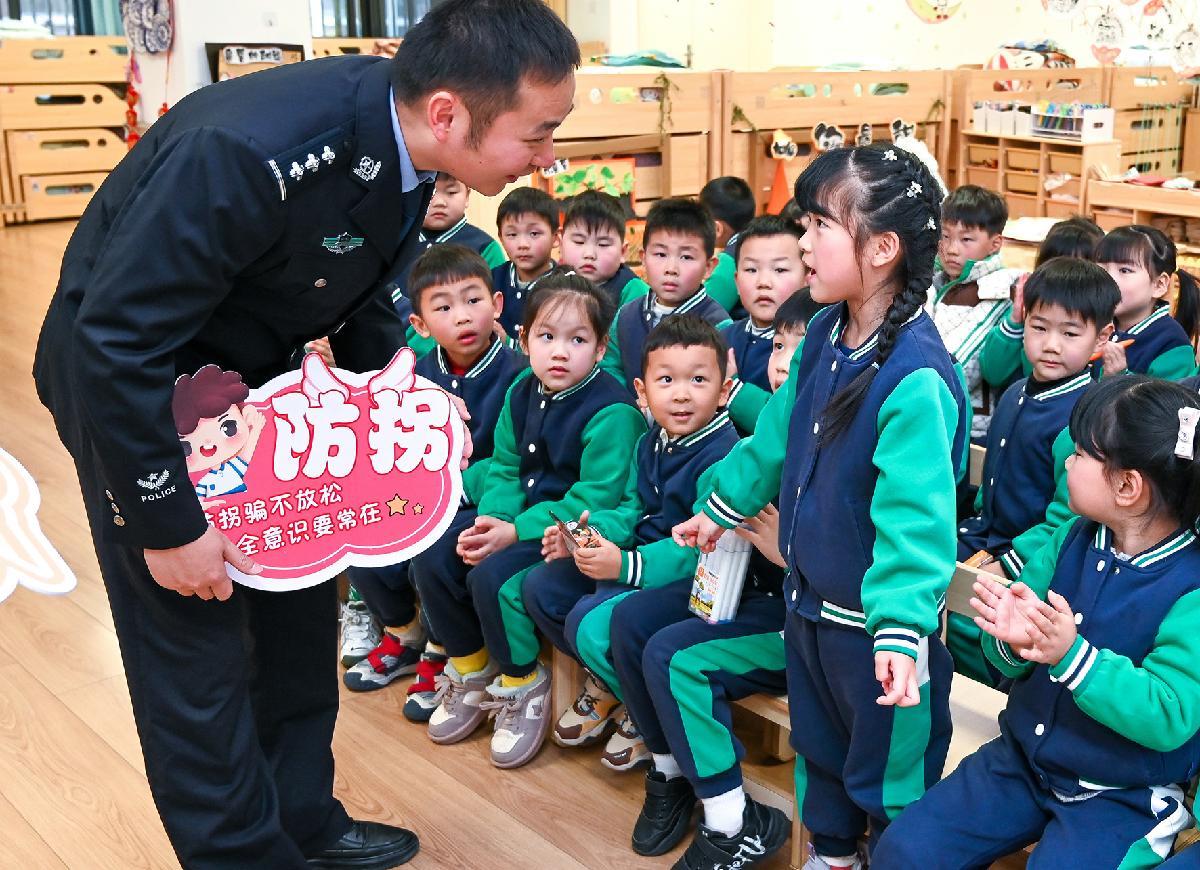 3月5日,安徽省馬鞍山市和縣公安局民警在歷陽鎮(zhèn)幼兒園與小朋友們互動交流,宣講防拐騙、交通安全、消防安全等知識。