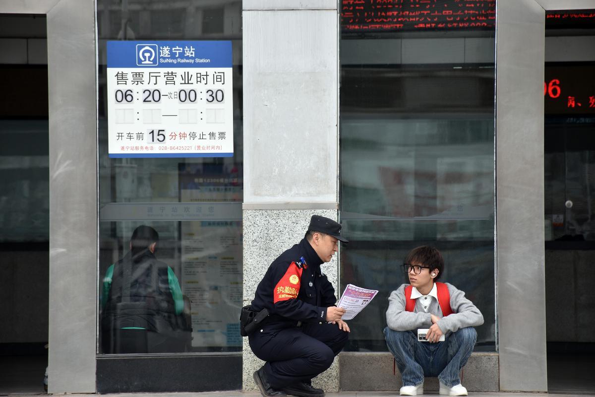 3月20日,成都鐵路公安處遂寧站派出所民警向旅客發(fā)放反詐提示卡,并耐心講解防騙要點。
