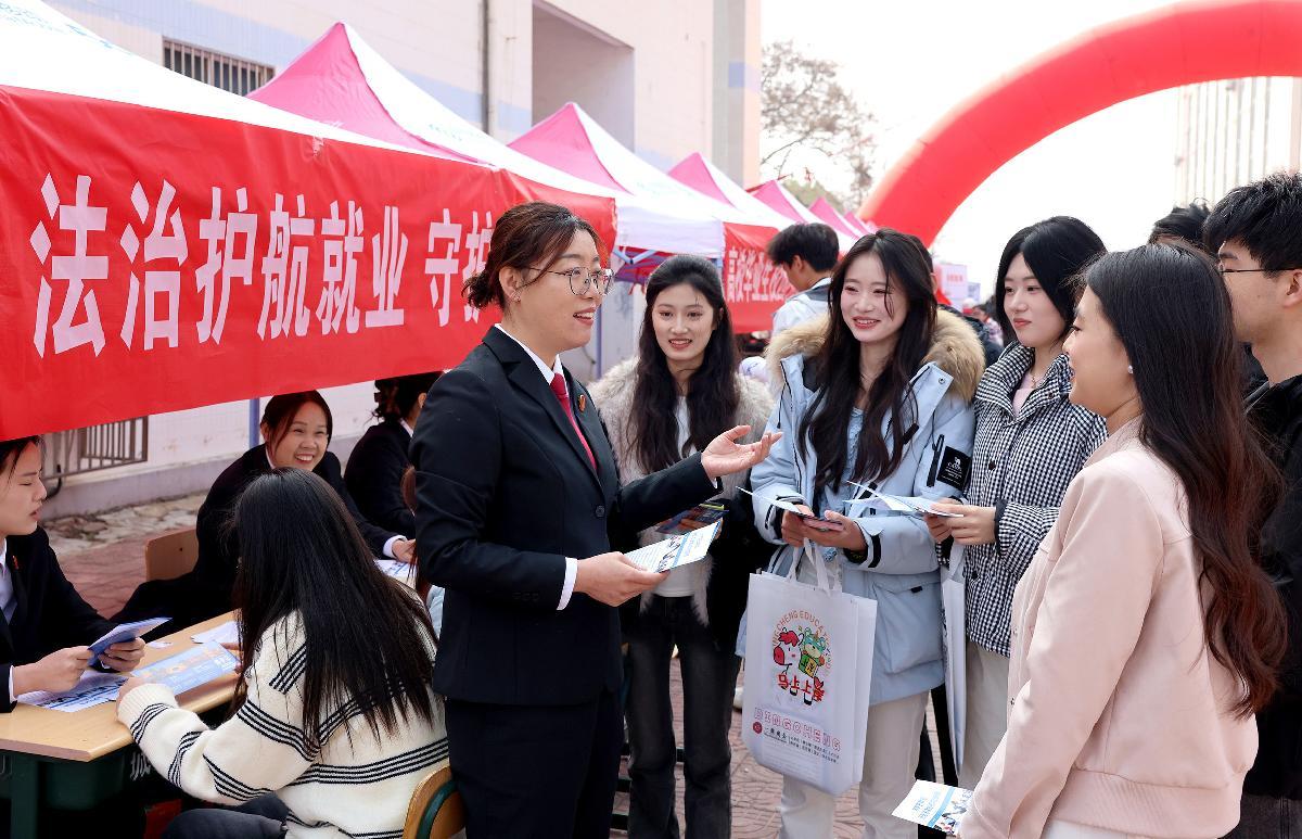 3月21日,山東省棗莊市市中區(qū)人民法院法官在棗莊學(xué)院2026年春季雙選會(huì)招聘活動(dòng)現(xiàn)場,向求職大學(xué)生們宣傳勞動(dòng)用工相關(guān)法律法規(guī)。