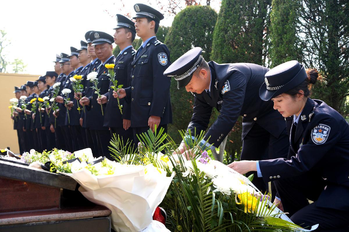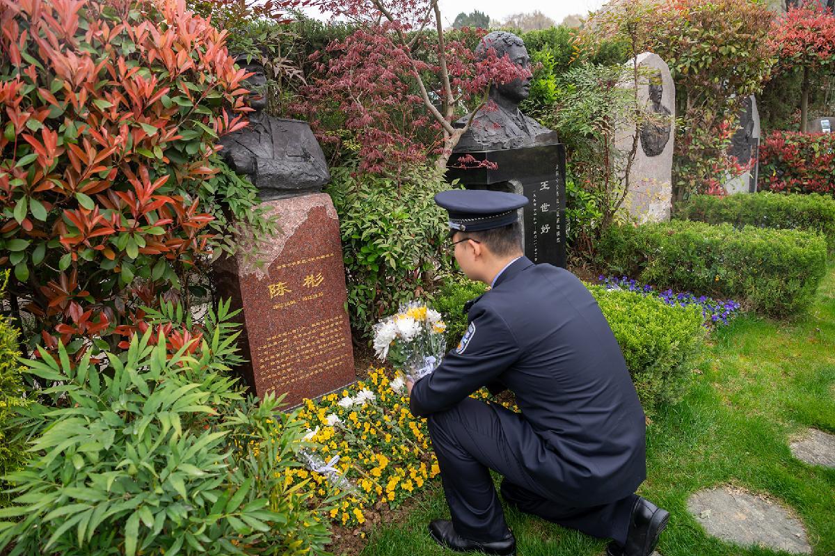 3月27日,安徽省合肥市公安局蜀山分局組織青年民警在大蜀山文化陵園開展清明祭公安英烈活動,公安英模陳彬之子、民警陳文琛祭奠父親。