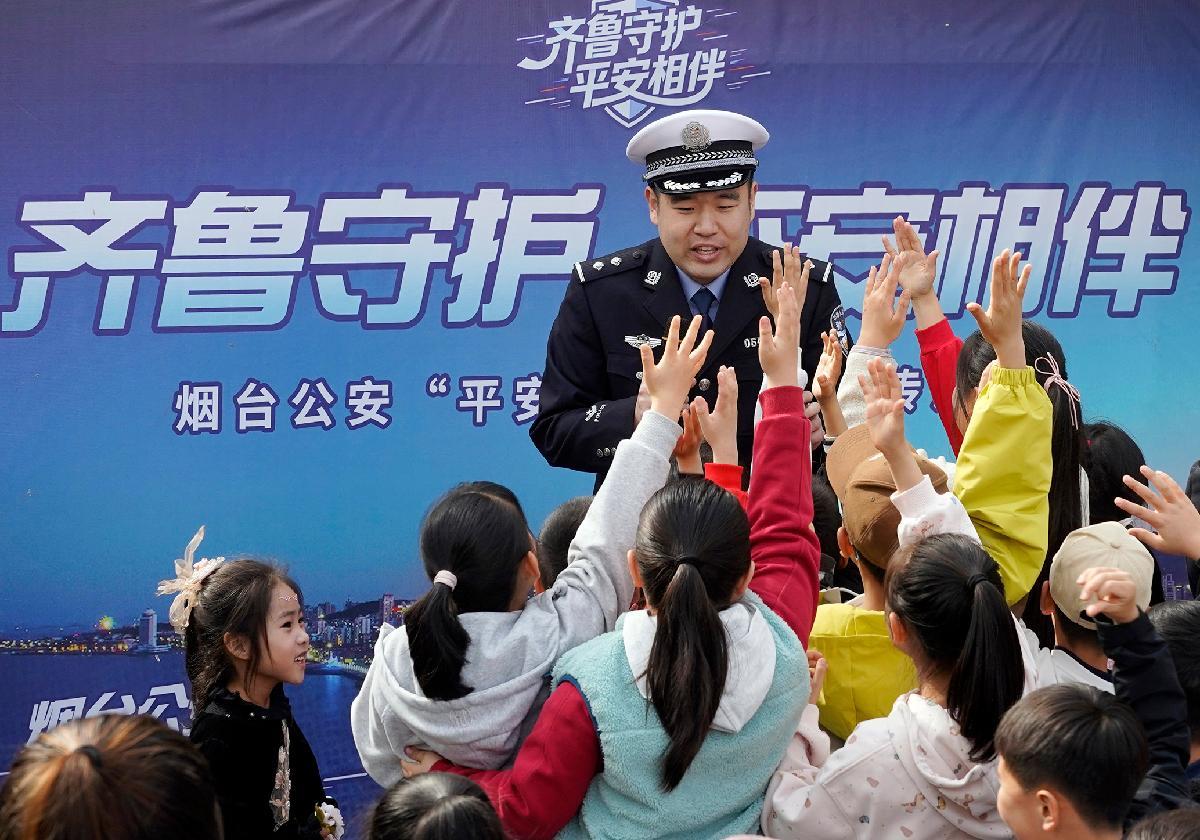 4月11日,山東省煙臺市公安局在牟平區(qū)龍湖櫻花大道舉辦“齊魯守護·平安相伴”春日游園會,現(xiàn)場小朋友積極參與交通安全游戲。