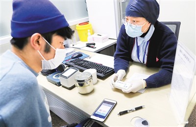 1月7日,上海市部分社區(qū)預(yù)防接種門診開始為因私出國工作、學(xué)習(xí)人員提供新冠疫苗預(yù)約緊急接種服務(wù)。自2021年1月7日0時起,上海市民可通過“健康云”APP在線24小時登記和預(yù)約。圖為上海市徐匯區(qū)康健街道社區(qū)衛(wèi)生服務(wù)中心醫(yī)務(wù)人員向接種者展示疫苗品名和有效期等信息。