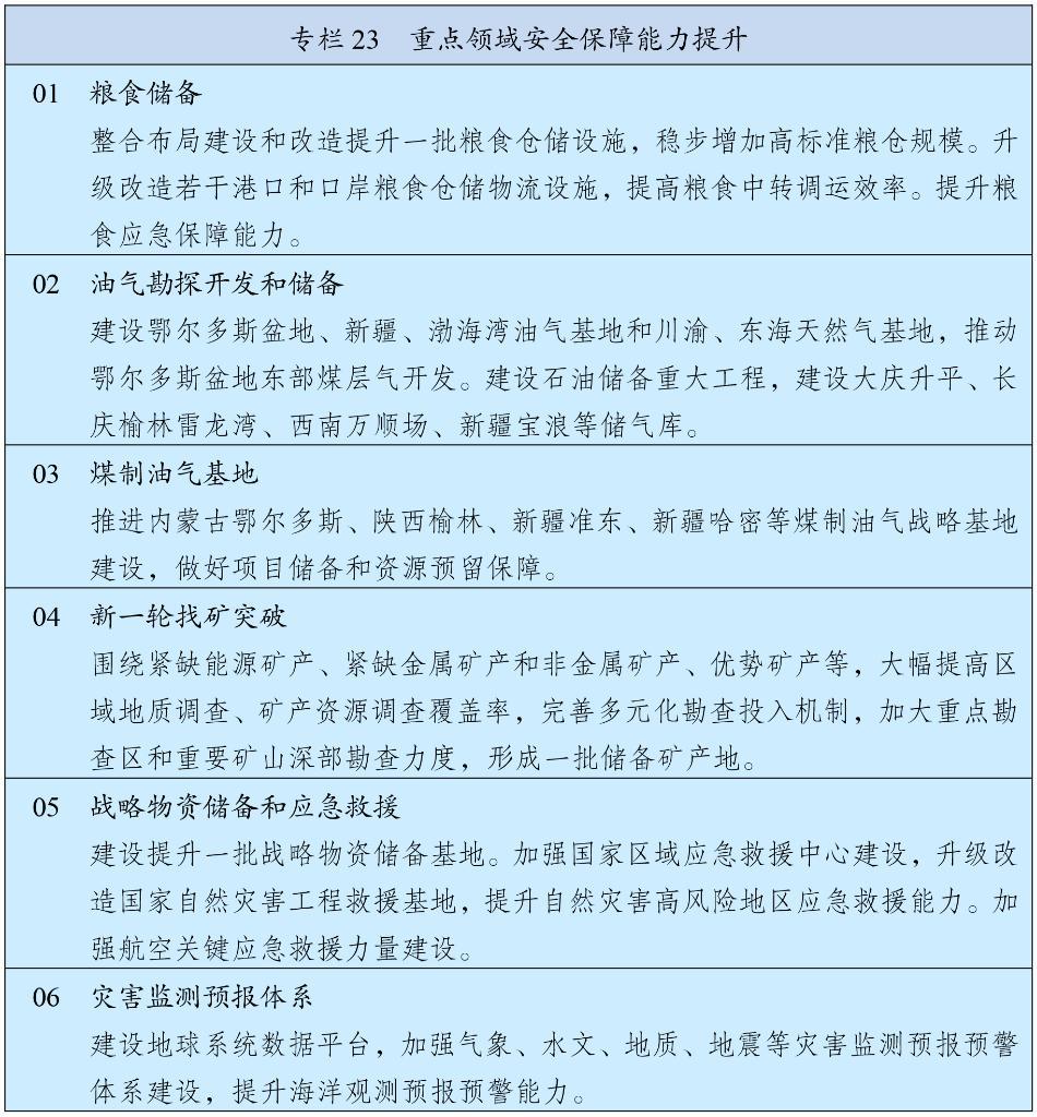 堅持立足國內、補齊短板、多元保障、強化儲備,加強能源產供儲銷體系建設。堅持油氣核心需求自主保障,實施中長期油氣增儲上產戰(zhàn)略行動,確保原油年產量穩(wěn)定在2億噸左右、天然氣產量穩(wěn)步增長,加強煤制油氣產能和技術儲備。強化政府儲備和企業(yè)儲備協(xié)同,提升國家石油儲備規(guī)模,建立更加靈活的輪換動用機制,增強天然氣儲備調節(jié)保障能力,完善煤炭儲備體系。健全能源保供中長期合同制度,完善電力應急調度機制和備用電源配置,強化能源需求側管理。加強戰(zhàn)略性礦產資源勘探開發(fā)和儲備,深入實施新一輪找礦突破戰(zhàn)略行動,統(tǒng)籌加強產品、產能和產地儲備,推動大宗商品儲運基地建設,提升戰(zhàn)略性礦產資源安全風險監(jiān)測預警和應急保供水平。加強能源資源開發(fā)國際合作,維護戰(zhàn)略通道安全。