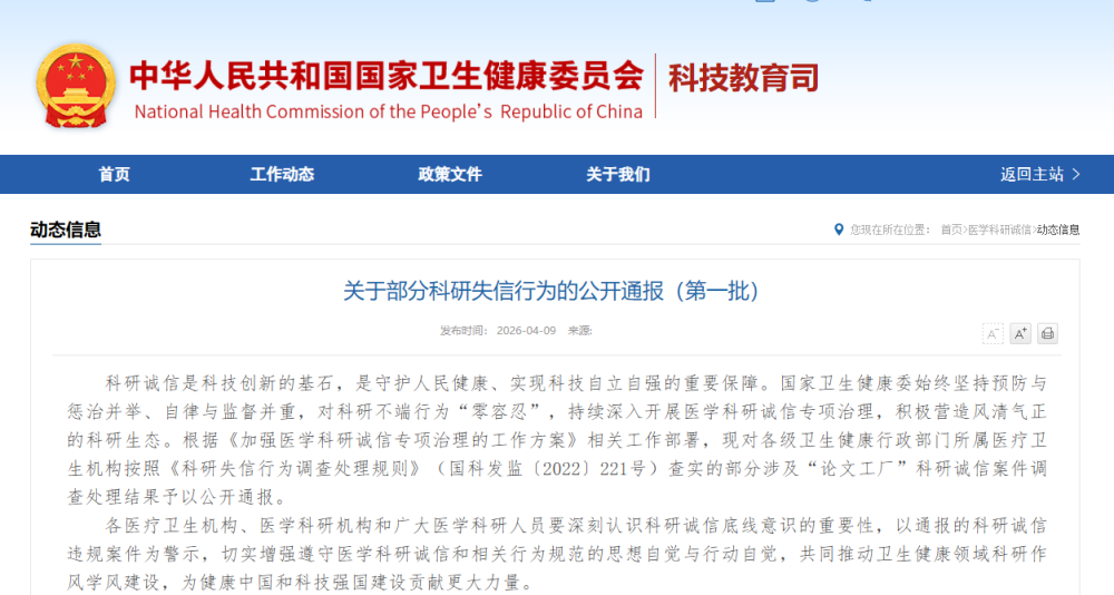 科研誠信是科技創(chuàng)新的基石,是守護(hù)人民健康、實(shí)現(xiàn)科技自立自強(qiáng)的重要保障。國家衛(wèi)生健康委始終堅(jiān)持預(yù)防與懲治并舉、自律與監(jiān)督并重,對科研不端行為“零容忍”,持續(xù)深入開展醫(yī)學(xué)科研誠信專項(xiàng)治理,積極營造風(fēng)清氣正的科研生態(tài)。根據(jù)《加強(qiáng)醫(yī)學(xué)科研誠信專項(xiàng)治理的工作方案》相關(guān)工作部署,現(xiàn)對各級衛(wèi)生健康行政部門所屬醫(yī)療衛(wèi)生機(jī)構(gòu)按照《科研失信行為調(diào)查處理規(guī)則》(國科發(fā)監(jiān)〔2022〕221號)查實(shí)的部分涉及“論文工廠”科研誠信案件調(diào)查處理結(jié)果予以公開通報。