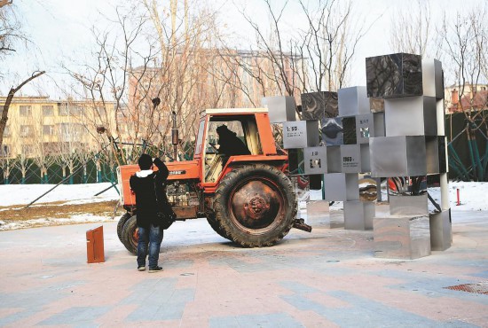 市民喜歡在園區(qū)內(nèi)的拖拉機上拍照留念。(記者韓玉紅 攝)