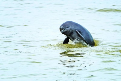 長(zhǎng)江南京段,一頭長(zhǎng)江江豚躍出水面。王臻琪攝/光明圖片