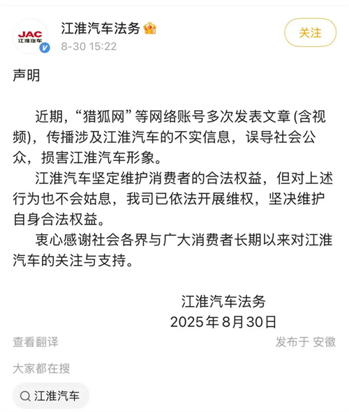 而在前一天的8月30日,@江淮汽車法務(wù)發(fā)布聲明:近期,“獵狐網(wǎng)”等網(wǎng)絡(luò)賬號多次發(fā)表文章(含視頻),傳播涉及江淮汽車的不實信息,誤導(dǎo)社會公眾,損害江淮汽車形象。江淮汽車堅定維護(hù)消費者的合法權(quán)益,但對上述行為也不會姑息,我司已依法開展維權(quán),堅決維護(hù)自身合法權(quán)益。