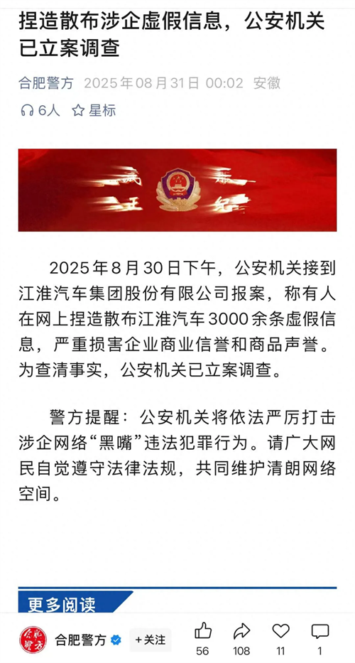 8月31日凌晨,“合肥警方”微信公眾號發(fā)文稱,2025年8月30日下午,公安機(jī)關(guān)接到江淮汽車集團(tuán)股份有限公司報案,稱有人在網(wǎng)上捏造散布江淮汽車3000余條虛假信息,嚴(yán)重?fù)p害企業(yè)商業(yè)信譽和商品聲譽。為查清事實,公安機(jī)關(guān)已立案調(diào)查。