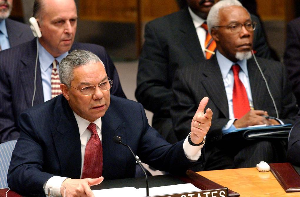 2003年2月5日,時任美國國務卿鮑威爾在聯(lián)合國安理會就伊拉克問題舉行的公開會議上向安理會通報有關伊拉克藏匿大規(guī)模殺傷性武器的所謂“證據(jù)”。 新華社記者彭張青攝(數(shù)碼傳真照片)