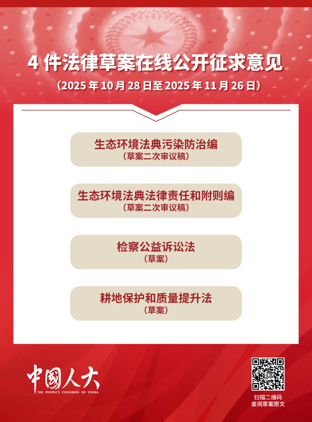 今天起,4件法律草案公開征求意見,截止日期為2025年11月26日。