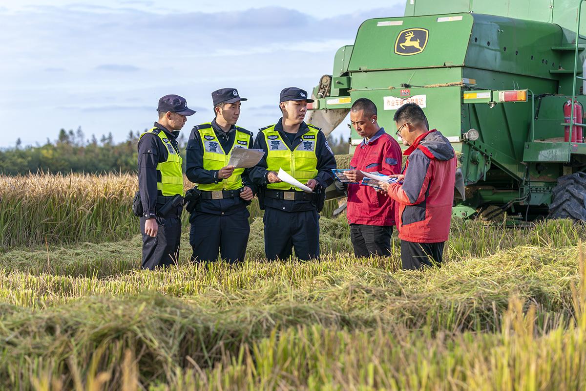 11月11日,上海市公安局崇明分局長江派出所組織民警走進田間地頭,向收割晚稻的農戶們開展防盜防騙、交通安全提示等宣防工作。