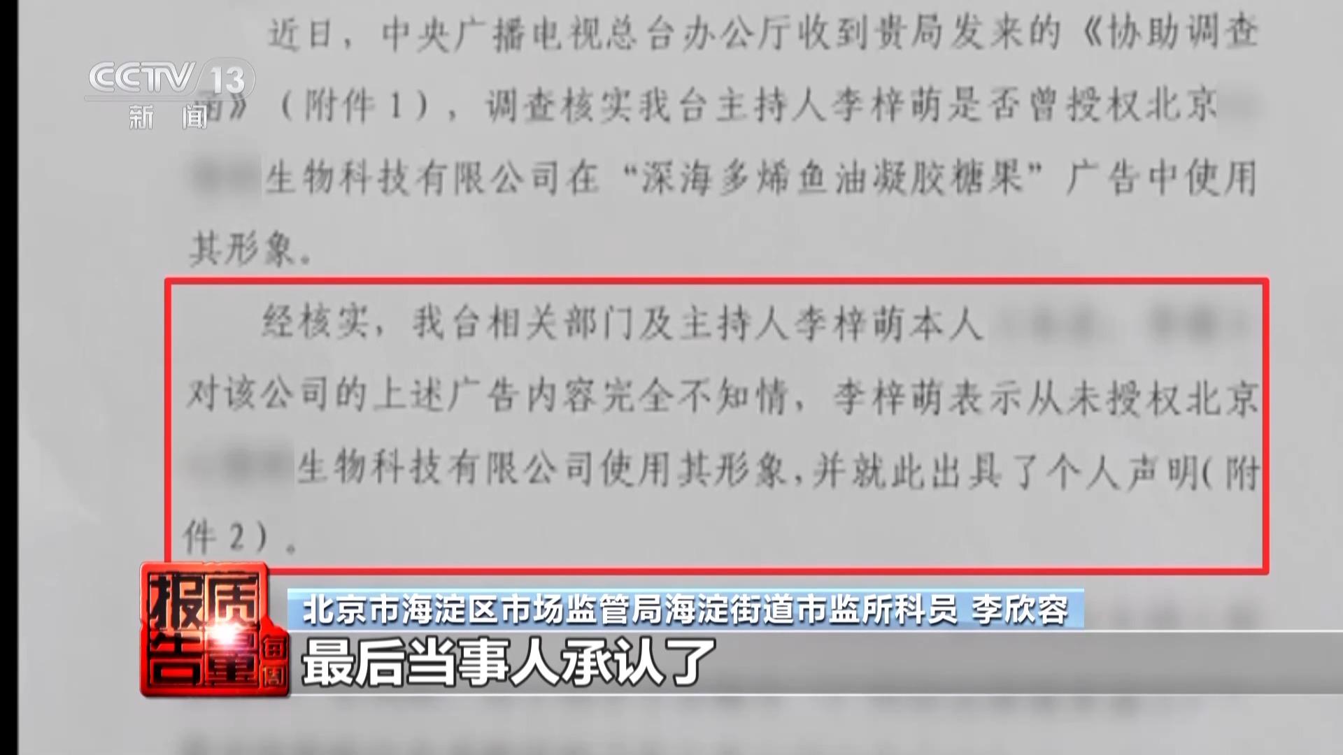北京市海淀區(qū)市場監(jiān)管部門經過向中央廣播電視總臺核實,最終確認,總臺主持人李梓萌從未代言這款魚油產品,也未授權使用其形象進行宣傳。