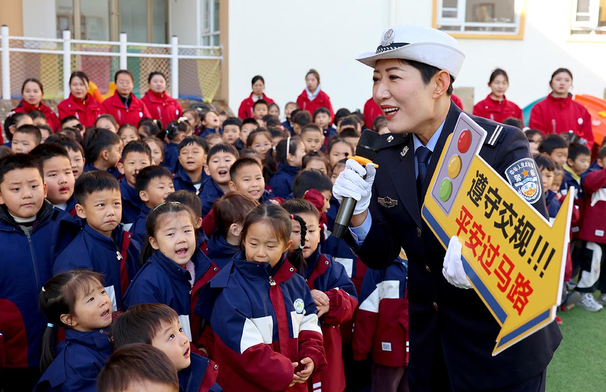 初冬時節(jié),山東省棗莊市公安局市中分局交通管理大隊開展冬季“護苗”交通安全宣傳,組織民警走進轄區(qū)幼兒園,通過形式多樣的方式,引導孩子們從小樹立遵守交通安全法規(guī)的意識。