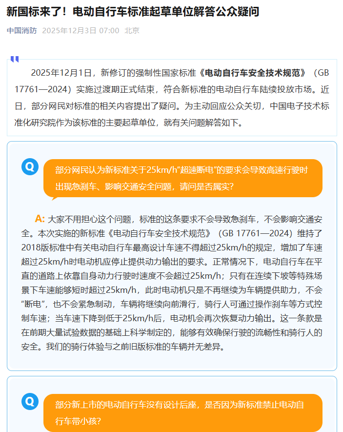 對(duì)于輿論追問,有關(guān)部門也做出回應(yīng)。12月3日,微信公眾號(hào)“中國消防”發(fā)布《電動(dòng)自行車標(biāo)準(zhǔn)起草單位解答公眾疑問》,電動(dòng)自行車新國標(biāo)主要起草單位中國電子技術(shù)標(biāo)準(zhǔn)化研究院表示“25km/h超速斷電不會(huì)導(dǎo)致急剎車影響交通安全”“新標(biāo)準(zhǔn)充分考慮了搭載兒童的使用場(chǎng)景,消費(fèi)者可在后座等位置安裝兒童安全座椅”,網(wǎng)傳“金屬鞍座”只是極個(gè)別案例,并稱“新標(biāo)準(zhǔn)禁止電動(dòng)自行車安裝后視鏡”“新標(biāo)準(zhǔn)實(shí)施導(dǎo)致電動(dòng)自行車門店大面積關(guān)閉”等消息不屬實(shí)。人民網(wǎng)、《新京報(bào)》等媒體紛紛轉(zhuǎn)載,澄清新標(biāo)準(zhǔn)的誤解和傳言。