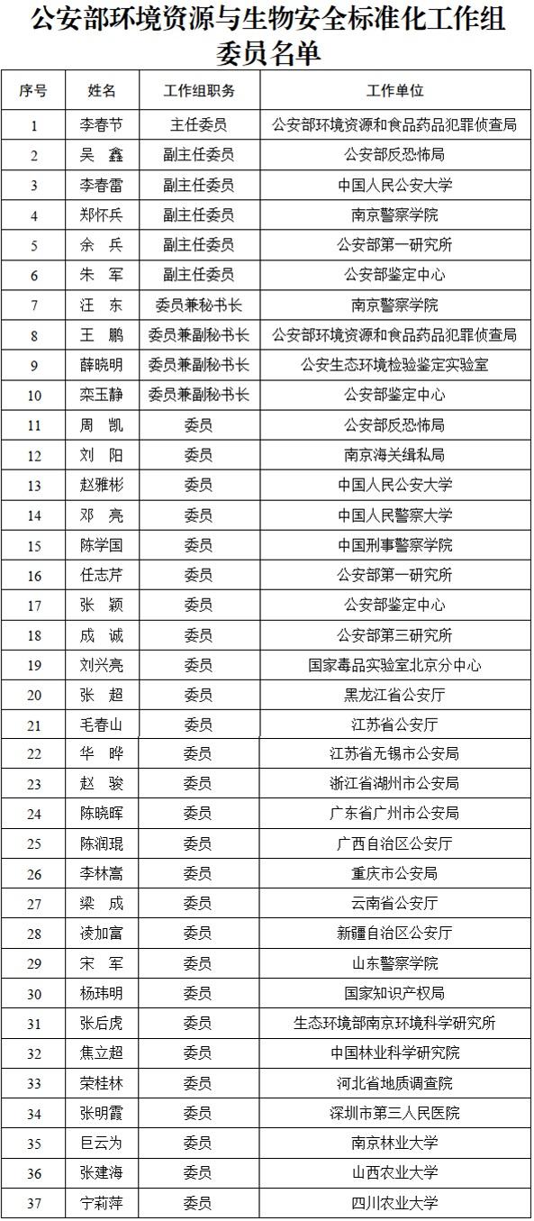 第一屆公安部環(huán)境資源與生物安全標(biāo)準(zhǔn)化工作組擬由37名委員組成(名單附后),李春節(jié)任主任委員,吳鑫、李春雷、鄭懷兵、余兵、朱軍任副主任委員,汪東任秘書長,王鵬、薛曉明、欒玉靜任副秘書長。秘書處由南京警察學(xué)院承擔(dān)。