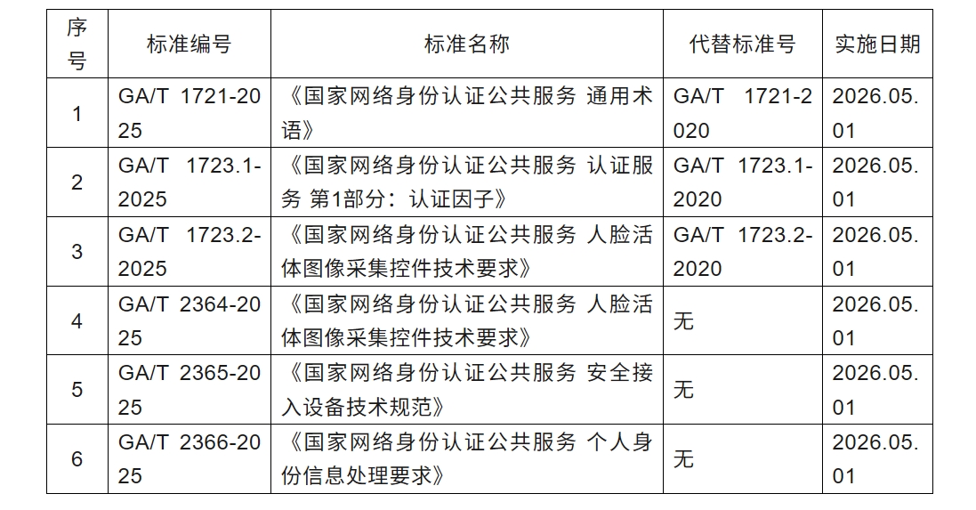 《國(guó)家網(wǎng)絡(luò)身份認(rèn)證公共服務(wù)管理辦法》已于2025年5月23日發(fā)布,并于7月15日實(shí)施。為支撐法規(guī)的落地與實(shí)施,近日公安部發(fā)布了2025年第2號(hào)《中華人民共和國(guó)公安部公共安全行業(yè)標(biāo)準(zhǔn)公告》,國(guó)家網(wǎng)絡(luò)身份認(rèn)證公共服務(wù)標(biāo)準(zhǔn)體系中6項(xiàng)公共安全行業(yè)標(biāo)準(zhǔn)正式發(fā)布,于2026年5月1日實(shí)施。標(biāo)準(zhǔn)具體內(nèi)容如下: