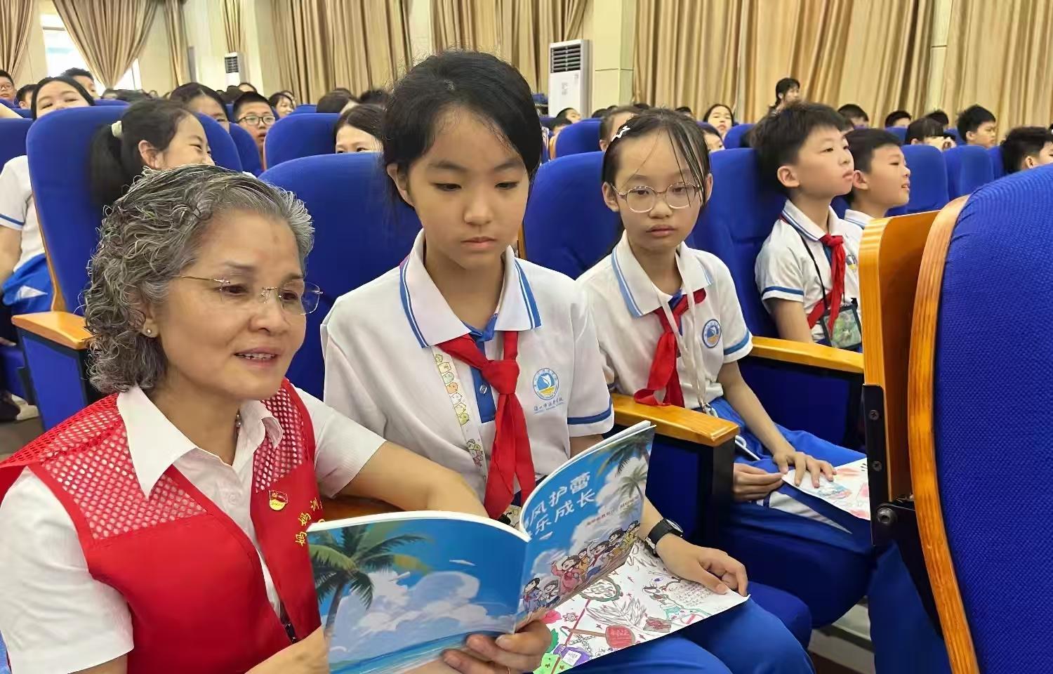 “媽媽訓教團”志愿者服務隊隊員謝盛東、李春燕、鄭愛琳、路婭莉、陳愛珍、彭紅威、楊桂云、符文寶、謝振榮、晏桂芬,海口市公安局美蘭分局紅島海岸派出所民警,以及學校400名師生共同參與活動。