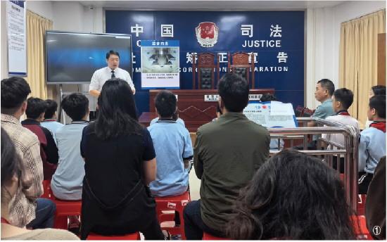 圖為駐區(qū)司法警察向前來(lái)參觀的學(xué)生講解社區(qū)矯正日常監(jiān)督管理措施。湯碧彥 攝