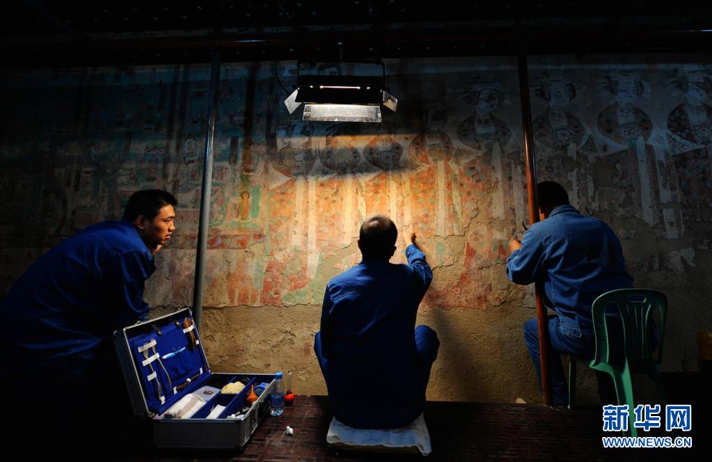 敦煌研究院技術人員在莫高窟98窟內(nèi)對病害壁畫進行修復(2014年9月3日攝)。新華社記者 陳斌 攝