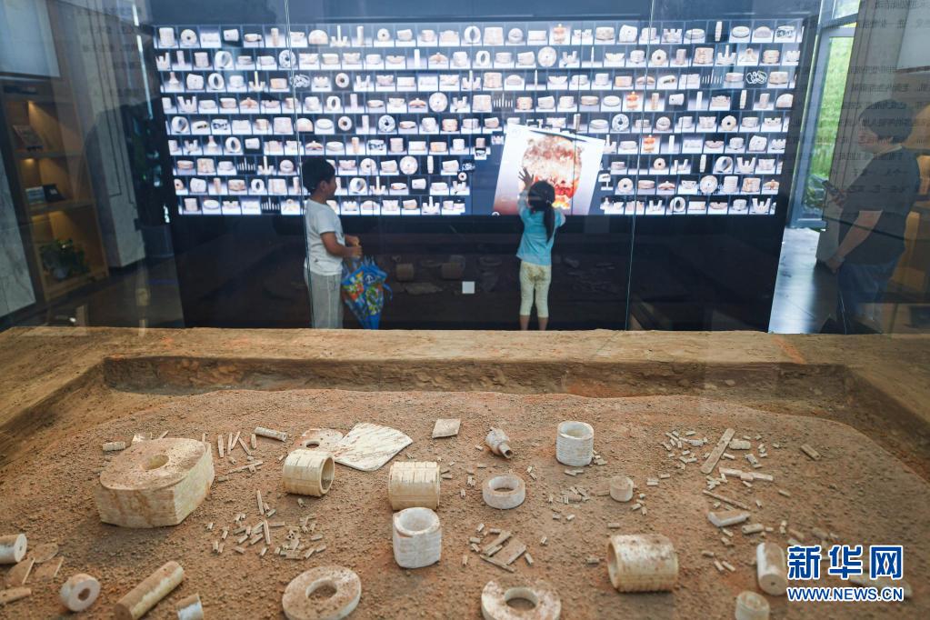 2020年6月6日,小游客在浙江省杭州市余杭區(qū)瓶窯老街的“良渚玉雕館”內(nèi)通過電子屏學習玉雕知識。新華社記者 徐昱 攝